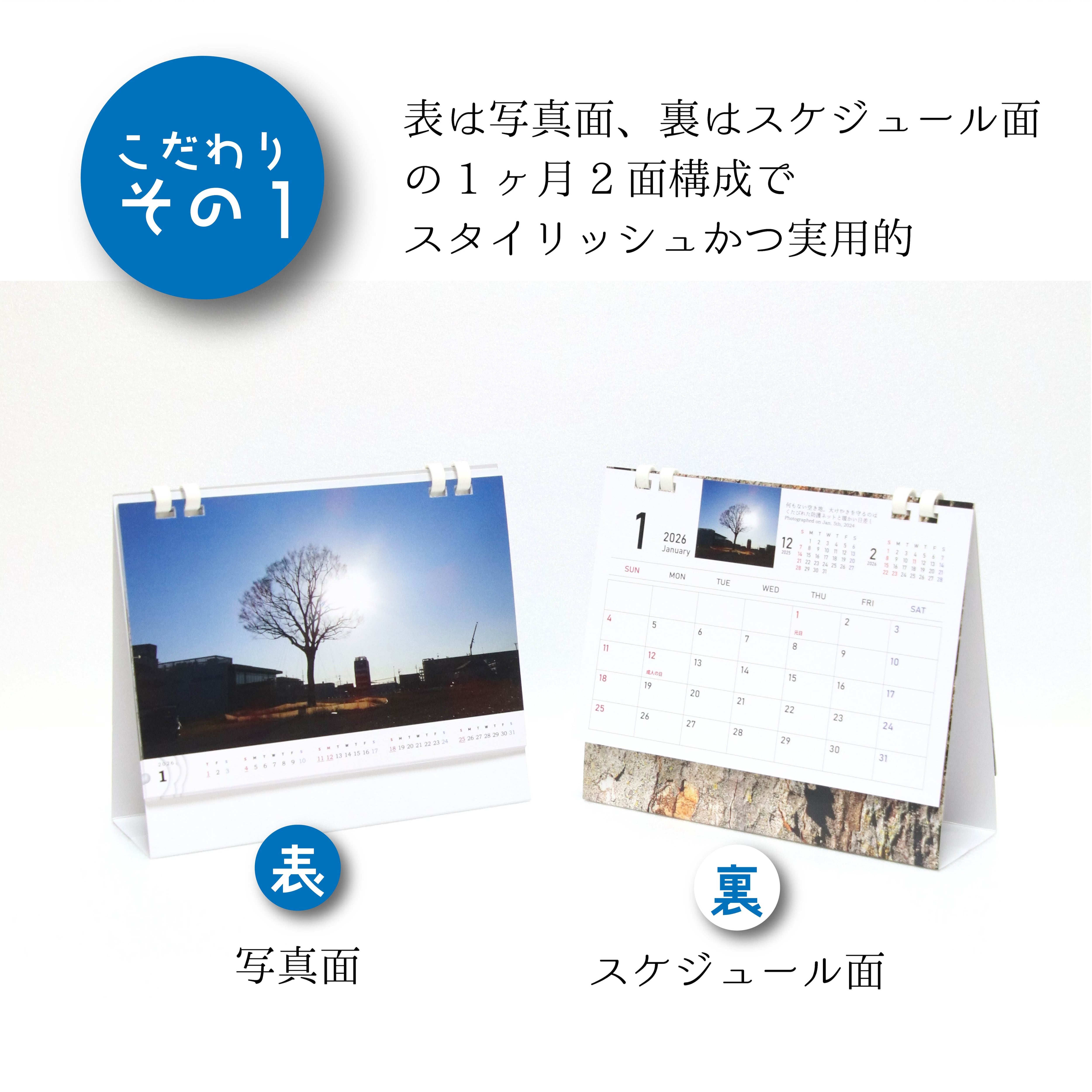 2025年版は撮影日付のみでしたが、2026年版からは写真の説明文をスケジュール面に追加しました。どんな時期に何に注目して撮られた写真なのかが明確になり、写真の中の世界に深く入ってご覧いただけます。