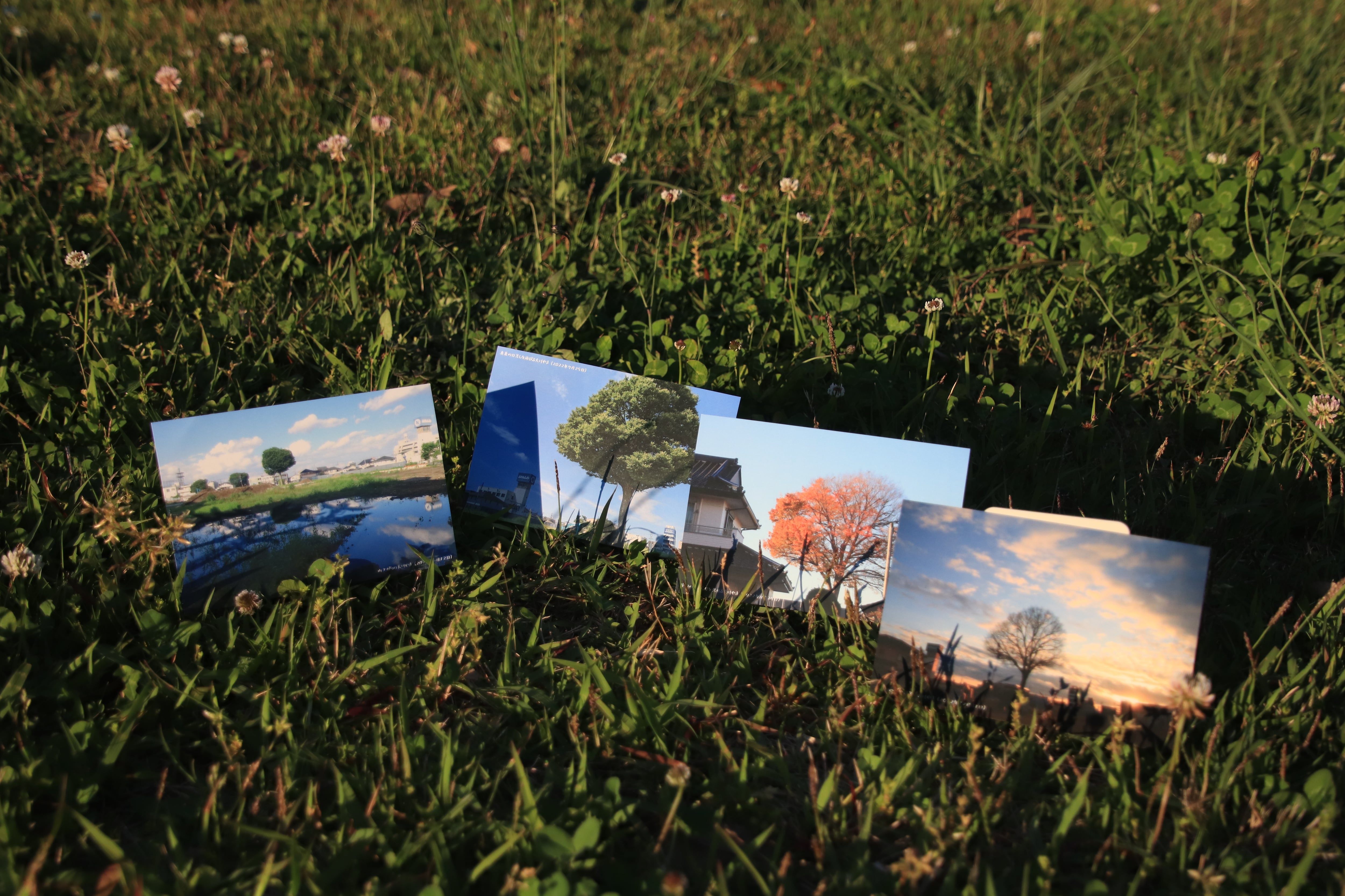 2022年の四季の特徴的な写真を4枚のポストカードにまとめました。宛名面にも入曽にそびえるけやきの姿やけやきの葉っぱがあしらわれています。